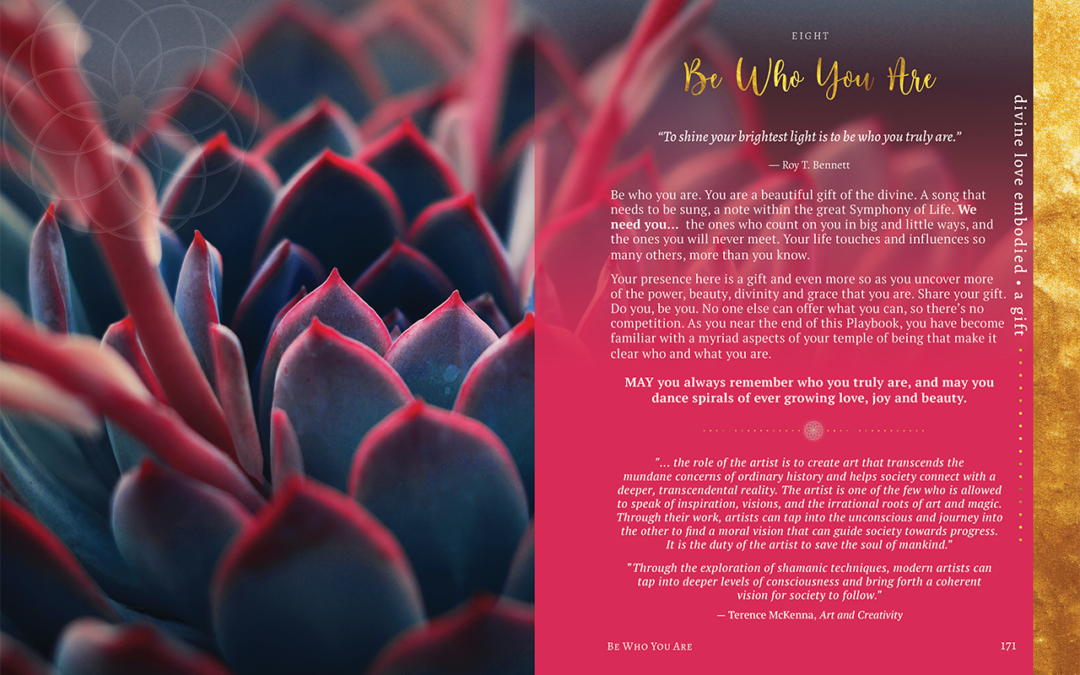 Your presence here is a gift and even more so as you uncover more of the power, beauty, divinity and grace that you are. Share your gift. Do you, be you. No one else can offer what you can, so there’s no competition. As you near the end of this Playbook, you have become familiar with a myriad aspects of your temple of being that make it clear who and what you are.