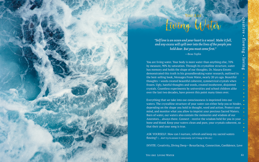 You Are Living Water You are living water. Your body is more water than anything else, 70% by measure, 90% by saturation. Through its crystalline structure, water has memory and holds the shape of our thoughts. Dr. Masaru Emoto demonstrated this truth in his groundbreaking water research, outlined in the best-selling book, Messages From Water, nearly 20 yrs ago. Beautiful thoughts + words created beautiful coherent, symmetrical crystals when frozen. Ugly, hateful thoughts and words, created incoherent, disjointed crystals. Countless experiments by universities and school children alike over the last two decades, have proven this point many times over.
