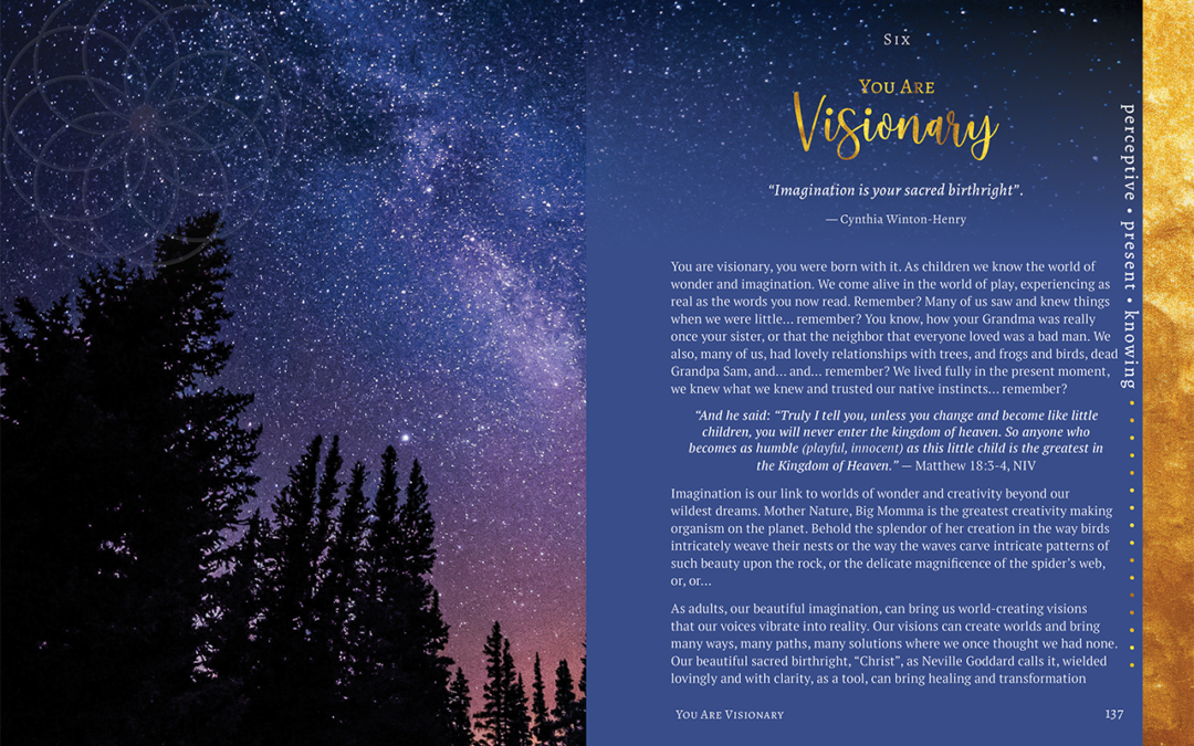 As adults, our beautiful imagination, can bring us world-creating visions that our voices vibrate into reality. Our visions can create worlds and bring many ways, many paths, many solutions where we once thought we had none. Our beautiful sacred birthright, “Christ”, as Neville Goddard calls it, wielded lovingly and with clarity, as a tool, can bring healing and transformation beyond anything we have ever imagined. By the power of imagination, we are linked to parts of ourselves and worlds that are beyond the one we normally inhabit.